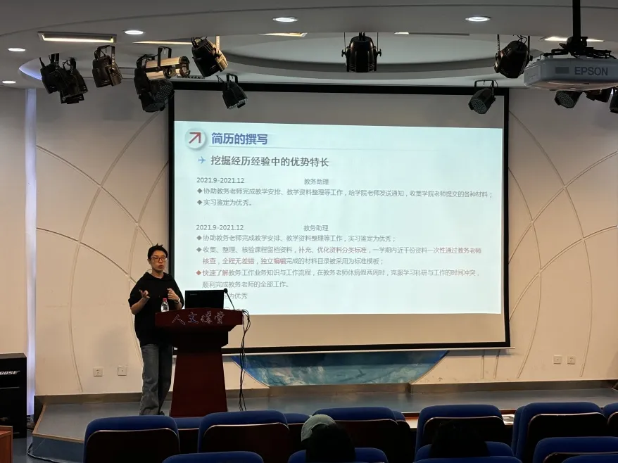 3月26日,人文学院邀请北航就业指导中心秦瑶老师为2020级、2021级和2022级本科生带来一场精彩的简历及面试求职经验分享,活动覆盖60余人。秦老师从简历的目的、目标职位需求、简历的撰写、面试技巧等为同学们带来详实的经验介绍,为准备春招和实习的同学一对一答疑解惑。